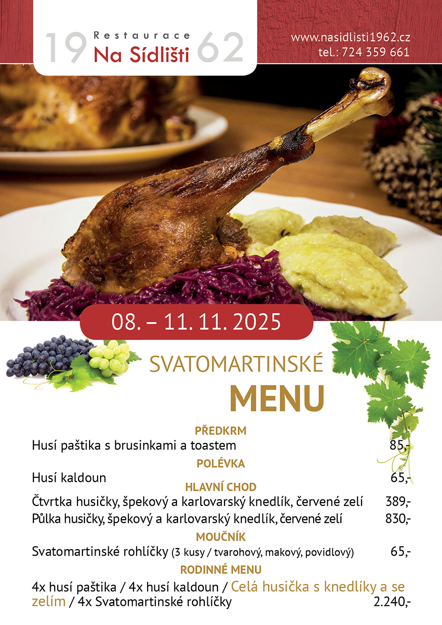 Sobota, 8. Listopad 2025Přijímáme objednávky na Svatomartinskou husičku na tel: 724359661 nebo on-line na mail: info@nasidlisti1962.cz